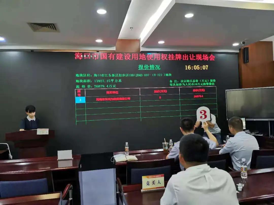 8月18日下午,海口市以掛牌方式出讓??诮瓥|新區(qū)2宗國(guó)有建設(shè)用地使用權(quán),地塊位于江東新區(qū)總部經(jīng)濟(jì)區(qū)(生態(tài)CBD)地塊JDQB-A01-04、JDQB-A07-(8~12),土地總面積為25939.1平方米(約38.91畝),分別由2016年—2020年(連續(xù)五年)《財(cái)富》雜志公布的世界500強(qiáng)企業(yè)京東集團(tuán)旗下關(guān)聯(lián)的兩家公司成功競(jìng)得,成交總價(jià)為39856.4985萬(wàn)元。
